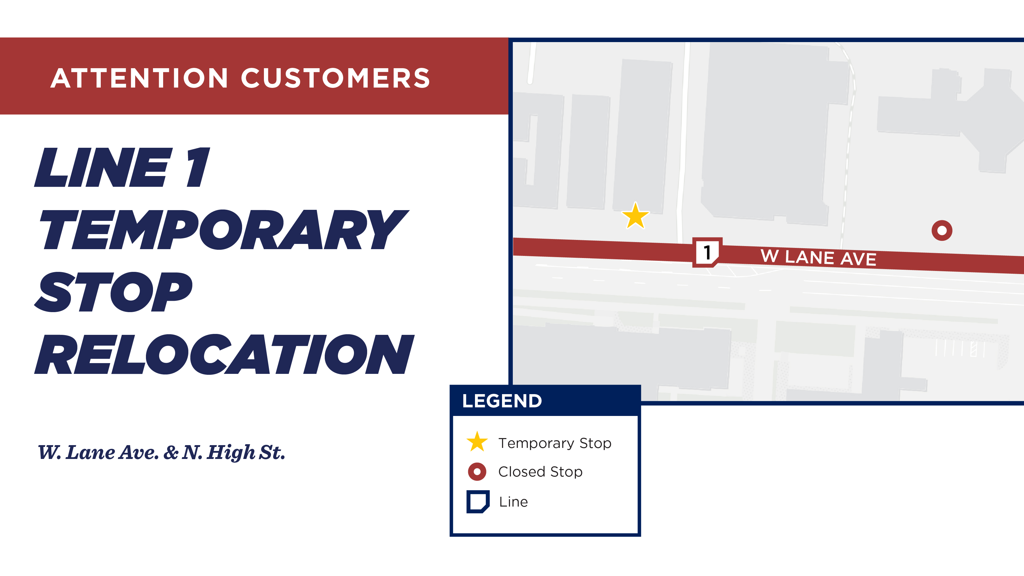 Due to construction, Stop 7536 at W. Lane Ave. & N. High St. (westbound) will relocate further west starting Monday, March 16. The relocation is expected to remain in place through 2028. The new stop location will be in the area of 80–84 W. Lane Ave. Riders should board at the relocated stop.