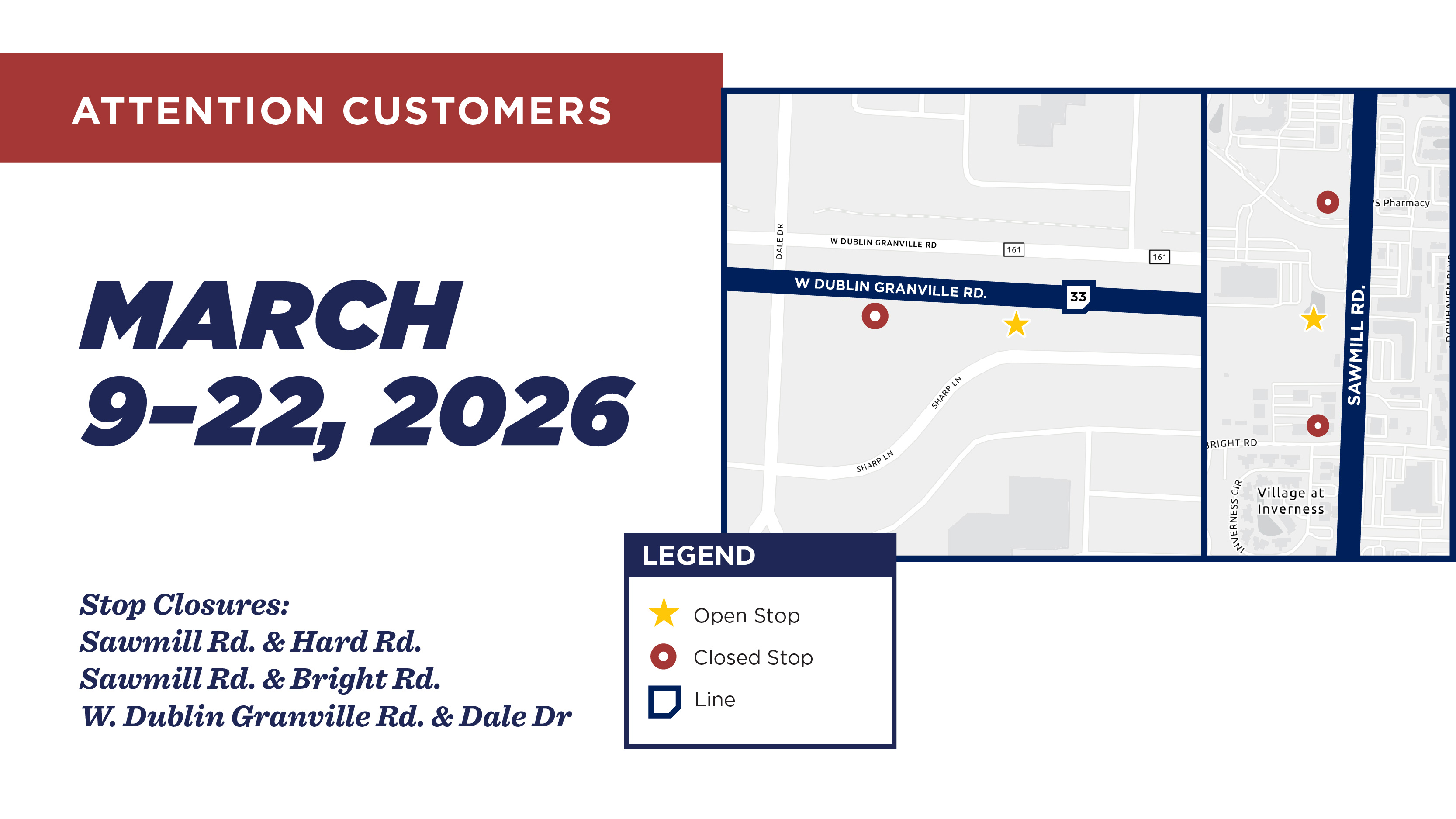 March 9-22, stops 7703 (W. Dublin Granville Rd & Dale Dr e/b), 7679 (Sawmill Rd & Bright Rd/Sawbury Rd s/b) and 7218 (Sawmill Rd & Hard Rd s/b) will close for construction.