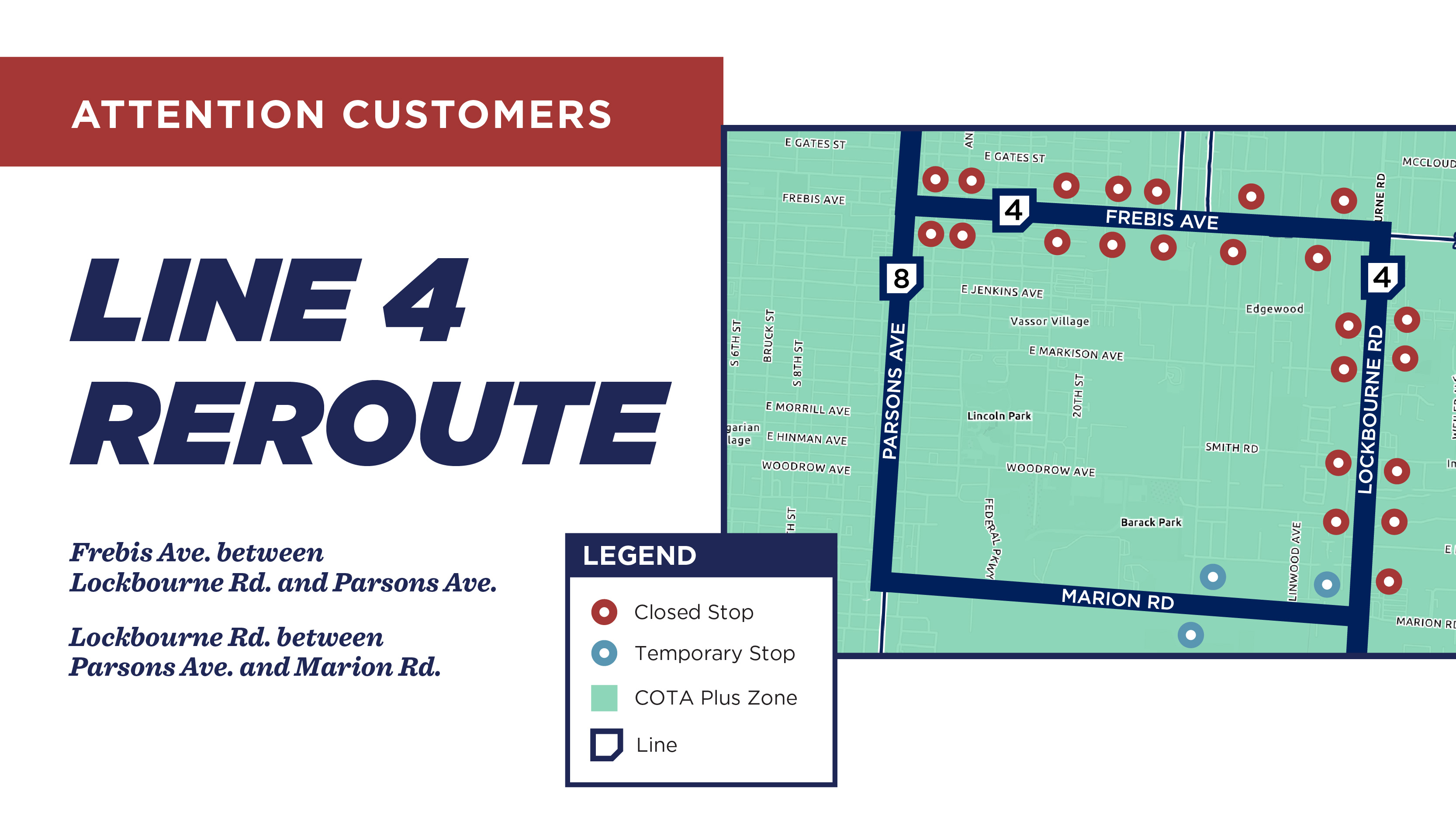 Impacted Stops: All stops on Frebis Ave. between Parsons Ave. and Lockbourne Rd., and all stops on Lockbourne Rd. between Parsons Ave. and Marion Rd.