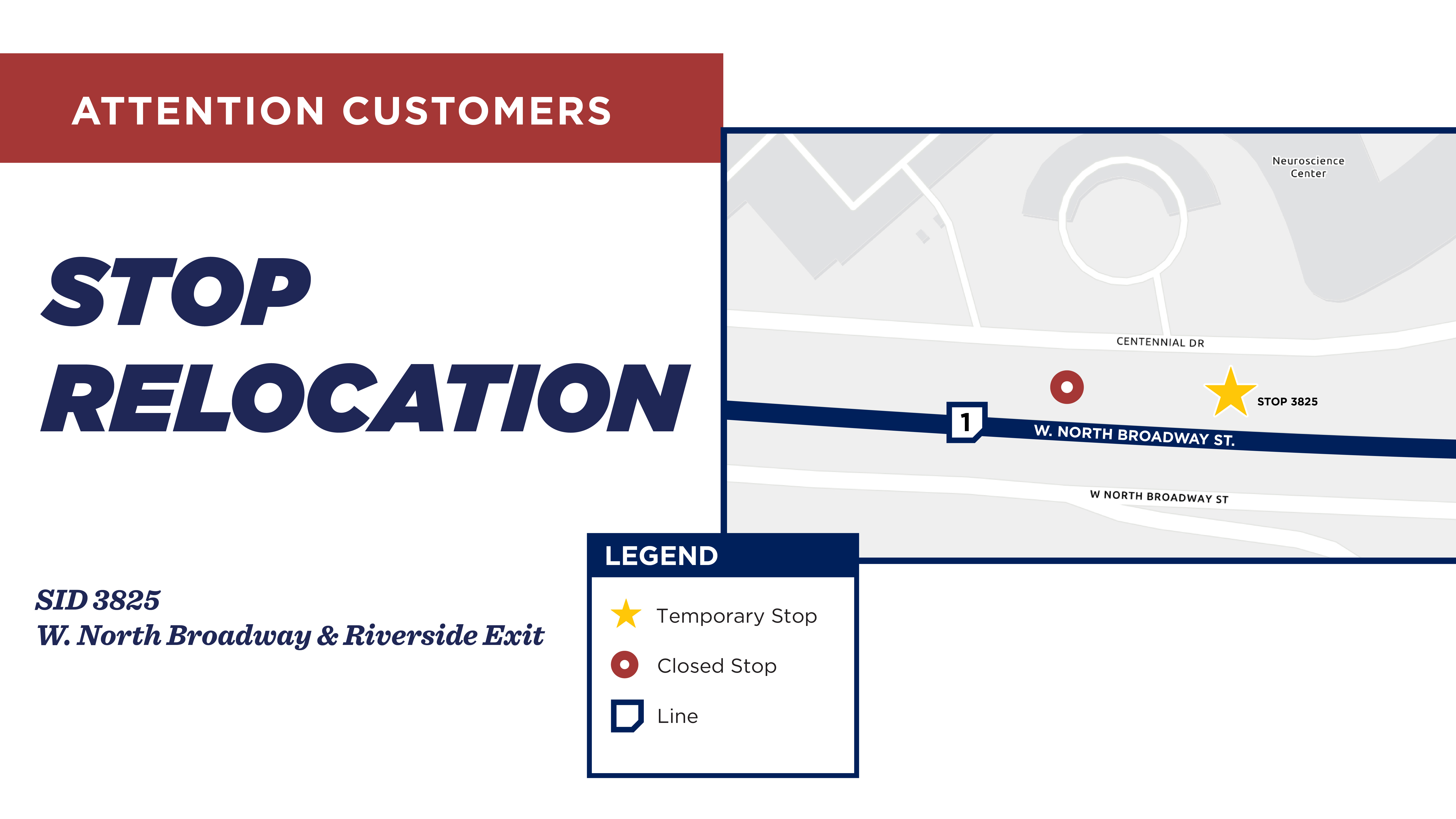Beginning Monday, March 2, Stop 3825 near the Riverside Hospital staircase will be relocated approximately 200 feet east to W. North Broadway due to roadway construction.