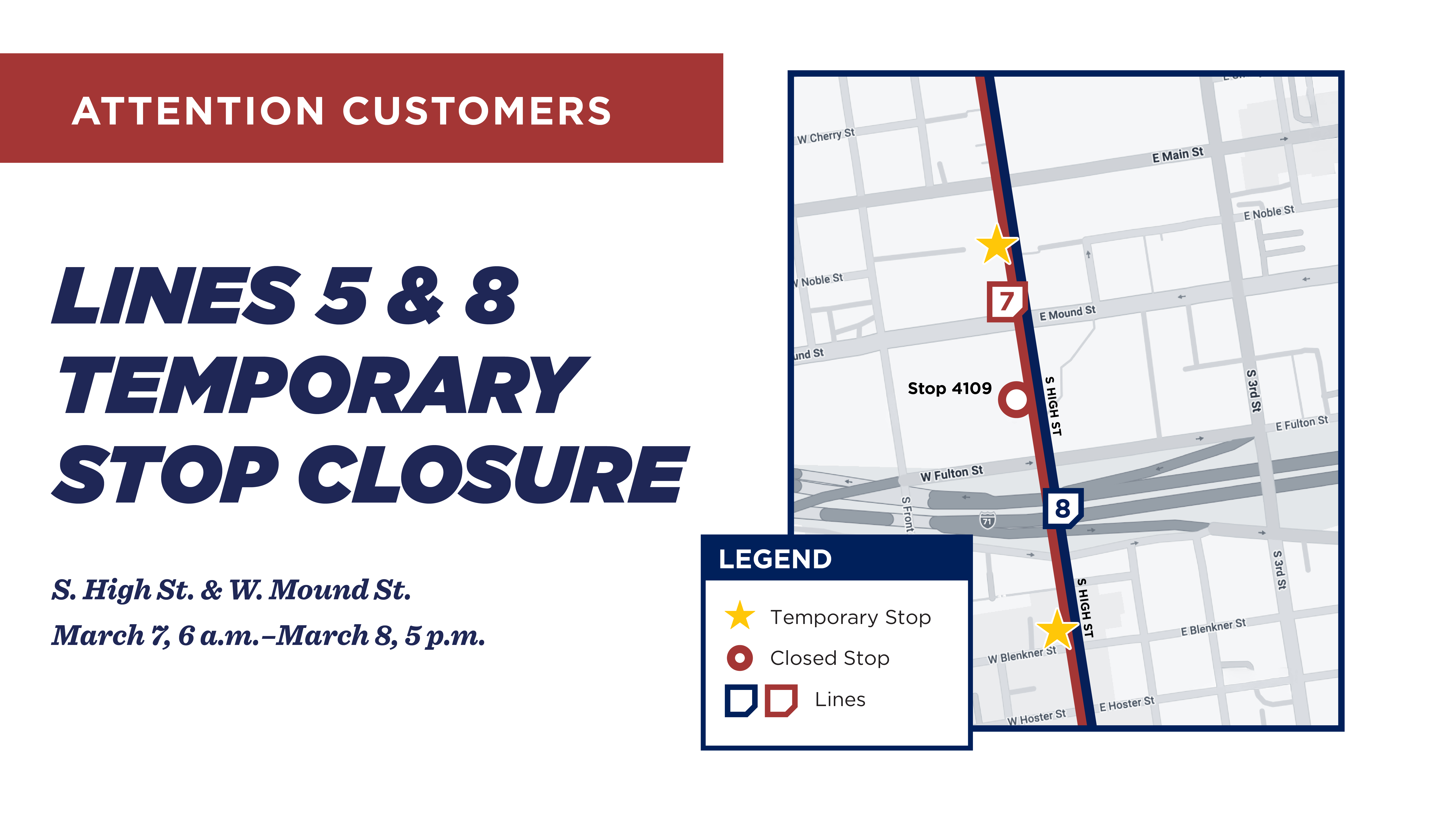 Due to construction, Stop 4109 at S. High St. & W. Mound St. (southbound) will be closed Saturday, March 7, from 6 a.m. through Sunday, March 8, at 5 p.m. Riders should use nearby same-directional stops during this time.