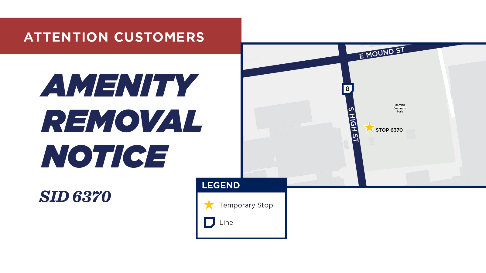 Permanent amenities at SID 6370 will be removed beginning March 2 to prepare for future construction. The stop location will remain in the same place. Riders should follow posted signage during this time.