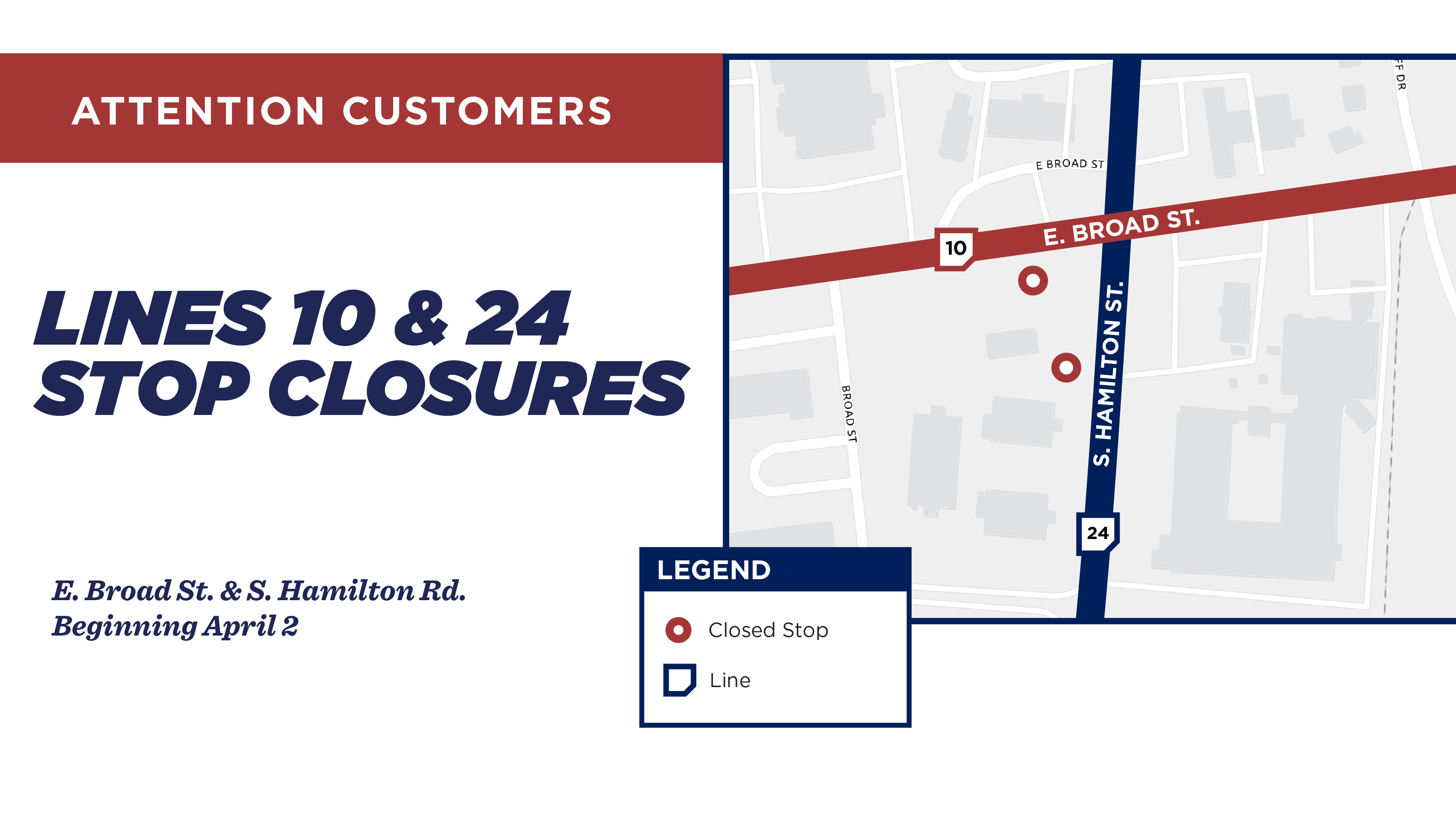 Due to construction, Stops 2509 and 7387 at E. Broad St. & S. Hamilton Rd. will temporarily close starting Thursday, April 2. Customers should use the nearest same-directional stop in the area for their desired line. Impacts are expected to last approximately 2–3 months.